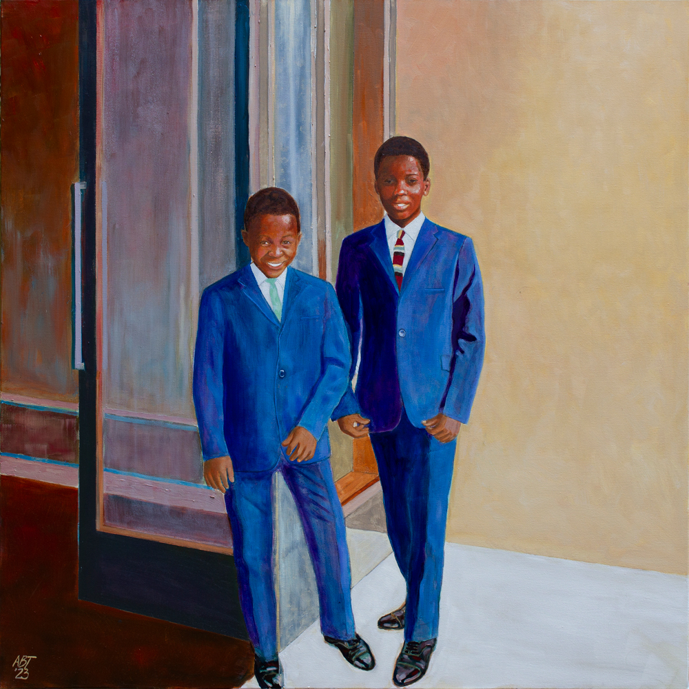 Arthur Timothy is an architect and painter whose works depict close family members and autobiographical events, specifically in Accra, Ghana where the artist was born, and Sierra Leone, where he lived until the age of 9. The paintings are inspired by small black and white family photographs and are imbued with vibrant colour, added from his memory and imagination, which update and bring life to the original imagery.