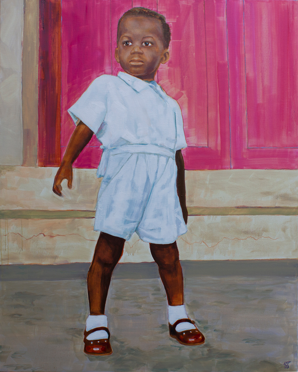 Arthur Timothy is an architect and painter whose works depict close family members and autobiographical events, specifically in Accra, Ghana where the artist was born, and Sierra Leone, where he lived until the age of 9. The paintings are inspired by small black and white family photographs and are imbued with vibrant colour, added from his memory and imagination, which update and bring life to the original imagery.