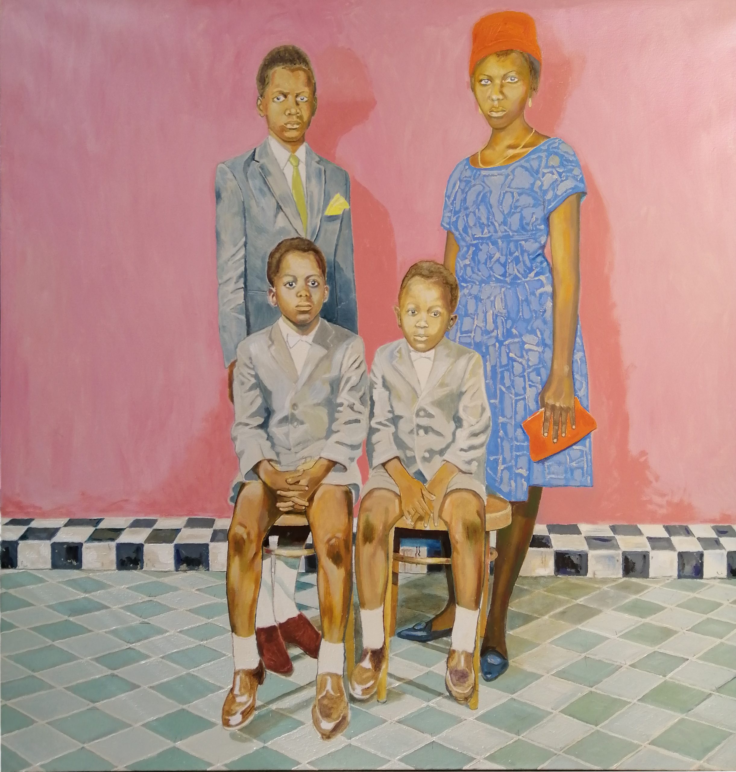 Arthur Timothy is an architect and painter whose works depict close family members and autobiographical events, specifically in Accra, Ghana where the artist was born, and Sierra Leone, where he lived until the age of 9. The paintings are inspired by small black and white family photographs and are imbued with vibrant colour, added from his memory and imagination, which update and bring life to the original imagery.