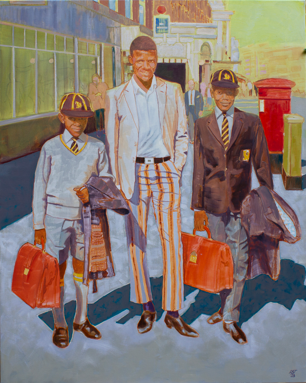 Arthur Timothy is an architect and painter whose works depict close family members and autobiographical events, specifically in Accra, Ghana where the artist was born, and Sierra Leone, where he lived until the age of 9. The paintings are inspired by small black and white family photographs and are imbued with vibrant colour, added from his memory and imagination, which update and bring life to the original imagery.