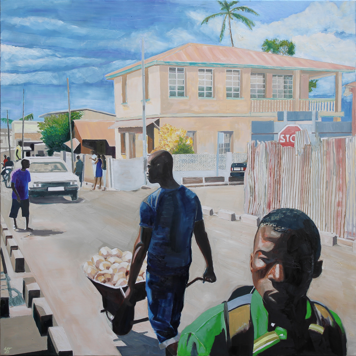 Arthur Timothy is an architect and painter whose works depict close family members and autobiographical events, specifically in Accra, Ghana where the artist was born, and Sierra Leone, where he lived until the age of 9. The paintings are inspired by small black and white family photographs and are imbued with vibrant colour, added from his memory and imagination, which update and bring life to the original imagery.